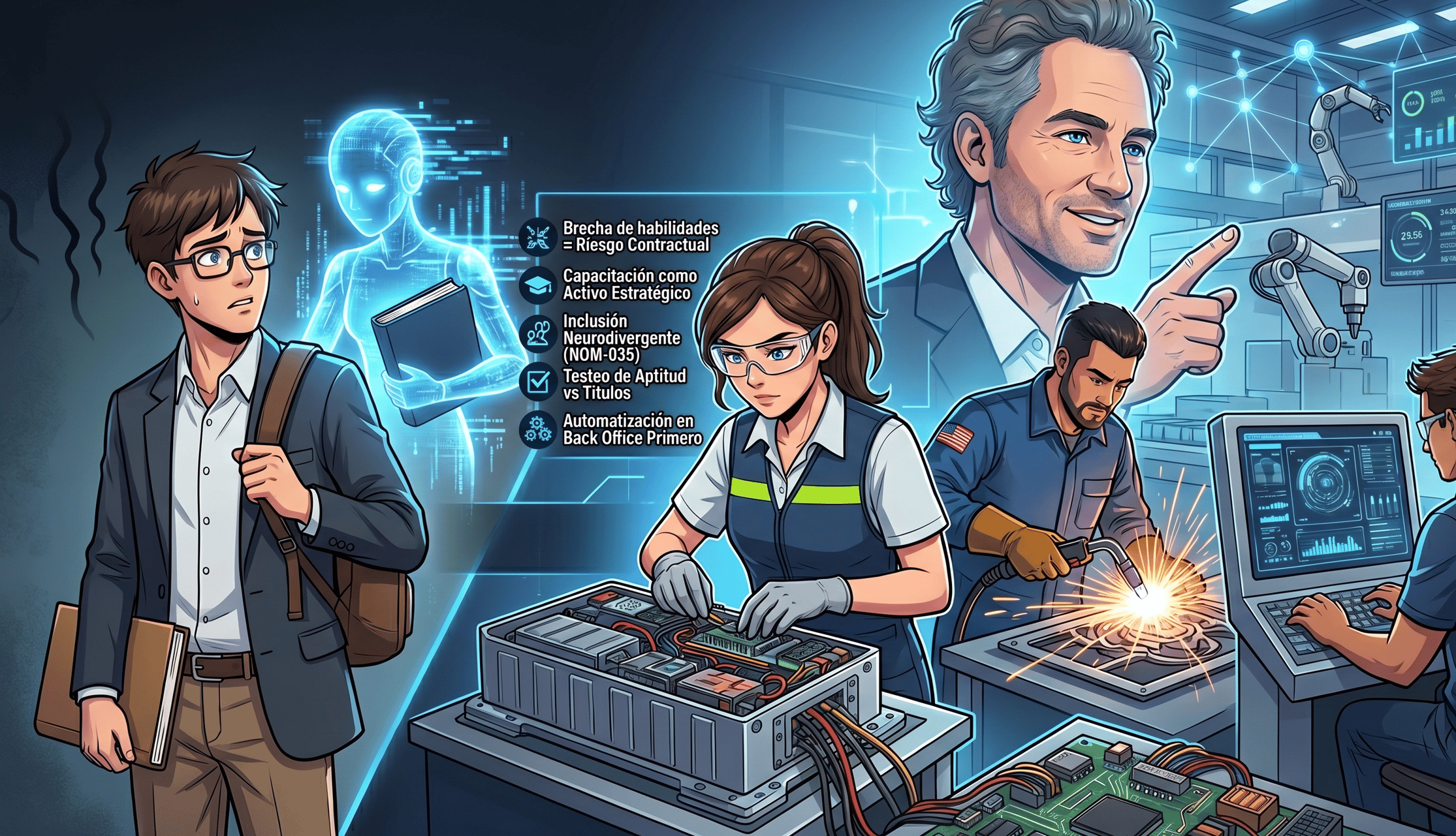 Para las empresas con operaciones en Baja California, Sonora, Chihuahua, Nuevo León, Coahuila y el Bajío, la pregunta estratégica no es "¿se destruirán empleos humanistas?" —esa discusión pertenece a la costa este de Estados Unidos. La pregunta para nosotros es: ¿Está nuestra documentación laboral, nuestros procesos de reclutamiento, y nuestra estrategia de retención, diseñados para capturar el valor creciente del trabajador técnico mexicano en la era de la IA?